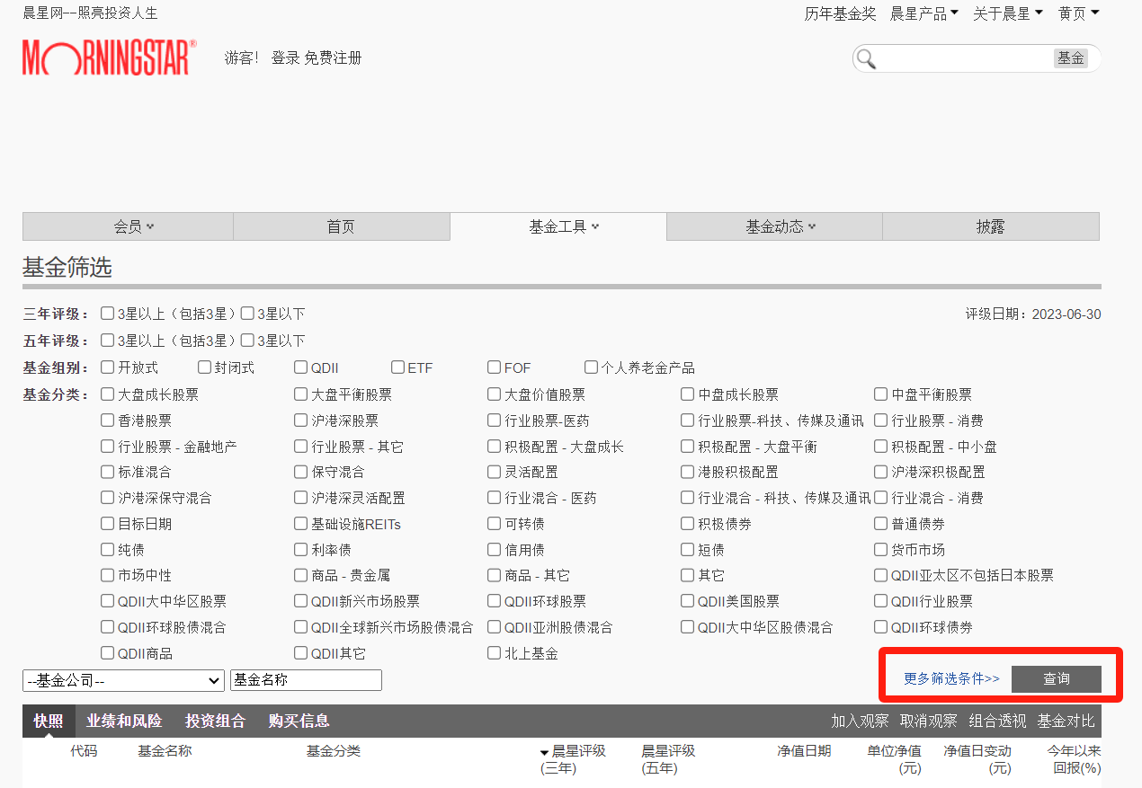 我在初步筛选债券基金时通常会使用晨星网的基金筛选工具,大家可以搜索晨星网进入到晨星网主页。进入主页后中间就可以看到基金筛选器这样一个小工具,点进去后就会出现下面这样可以选择筛选条件的页面