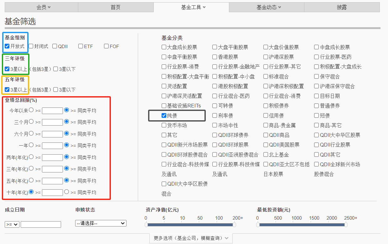 我们选择更多筛选条件来进行更详细的筛选,按照上面讲过的筛选标准我们选择纯债基金,三年和五年评级3星以上业绩总回报大于同类平均,点击查询进行初步筛选