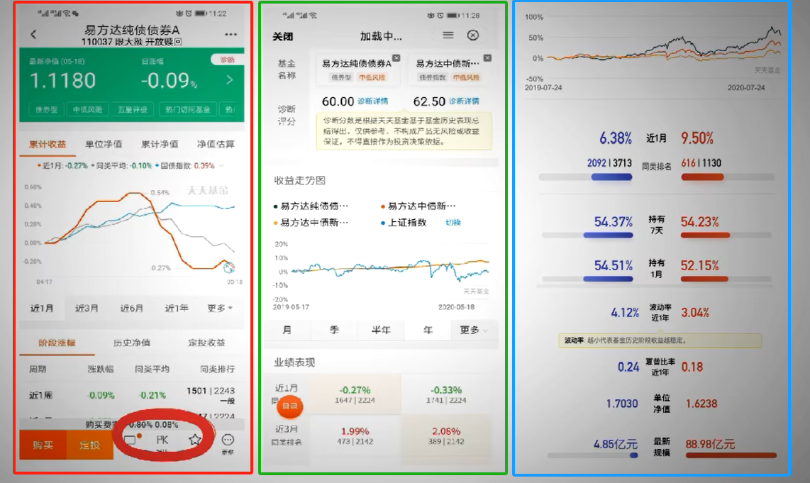 假设查询最终得到了3支纯债基金,如果你觉得条件过于严苛你可以根据自己的想法自由调整。同样的条件在普通债券基金下进行筛选的话,一般可以得到更多支基金。通过初步的筛选,可以帮我们过滤掉不少没有研究价值的基金,剩下的几支长期表现优秀的基金,我们接下来就可以对剩下的几支基金进行详细地对比,优中选优了。
