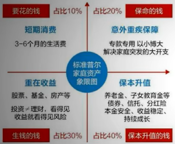 首先聊聊标普家庭资产象限,无论是家庭还是个人在开始理财投资前,都应该做出充分的准备,需要准备的第一件事就是梳理自身的资产状况,换句话说理财投资前你得先清楚你一共有多少财可理,其中有多少是短期可能会用到的,有多少是可以长时间不用的,你的风险承受能力怎么样,如何保证在未来突然生病了或发生意外时,你能快速拿出钱来处理,标准普尔家庭配置象限图就完美地解决了上面所有的问题,所以它是目前被公认为最合理稳健的家庭资产分配方式。看下面这张图,可以对比一下自己家庭资产配置的方案。