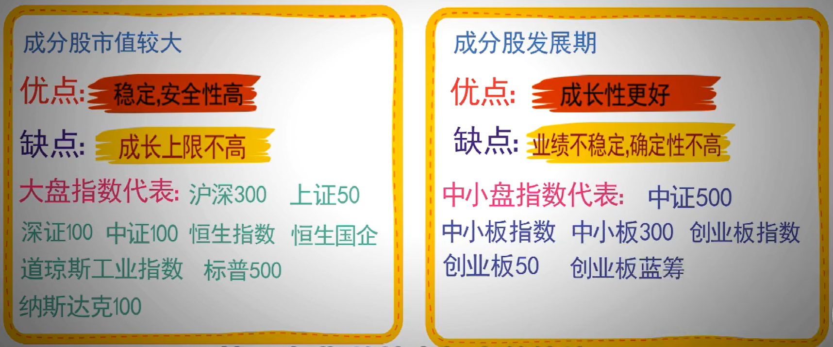 第二步大盘指数还是中小盘指数。经过第一步的选择后如果你决定选择宽基指数的话,那么你需要确定第二件事选择大盘指数还是中小盘指数?大盘指数一般来说成分股都是些市值比较大的大盘蓝筹股,优点就是稳定安全性高,缺点是成分股的成长上可能就没那么高了,毕竟一般这类公司都已经到了成熟期,已经过了高速发展的时期。相反中小盘指数的成分股市值都没那公大,大多数公司都处于发展期,成长性要更好些,但是缺点是可能业绩并不稳定,且末来的确定性没那么高,算是一把双刃剑吧。所以在选择指数时自然也需要考虑,是只投资于大盘指数或中小盘指数还是二者同时投资。