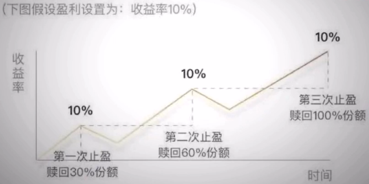 如图在收益率达到10%时,我不必全部卖出,而只是卖出30%的份额,再涨10%时赎回60%的份额,再涨10%时赎回全部的份额。通过分批赎回的方式来抵御不确定性带来的风险是一种进可攻退可守的止盈策略。上图的比例只是一个例子,大家可以根据自己的情况进行调整。例如我自前的收益率达到了20%,看不清未来行情,不知道会继续涨还是跌,那么你完全不必纠结,你可以先回一部分份额例如30%,如果继续上涨,剩下的那70%份额依旧会为你带来收益,只不过少赚一部分罢了图个安心。如果市场转为下跌,那么卖掉的30%可以帮你减小收益回撤的幅度,大家记住原理如此,但是收益率达到多少才开始赎回,继续上涨多少触发下一次正盈,每次止盈赎回多少份额,这些大家完全可以根据自身的情况作出灵活调整。