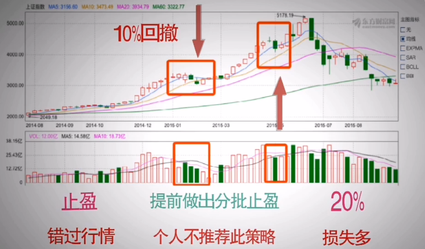 上图中的两个标记出来的点位都出现了最高接近10%的回撤,在当时的处境来看,是否就代表峰顶已经出现了呢,如果那时候止盈了,岂不是要错过后面的大行情了,峰顶还是十分难判断的。如果回撤幅度设置的过低,对于峰顶的判断不准确,如果回撤幅度设置到20%,你确实能判断出峰顶了,但是你的收益会损失得太多,可能还不如提前做出分批止盈操作来的轻松安心。所以个人不推荐这样的止盈方案,这要求投资者对于行情能有一个比较敏锐的判断才行。