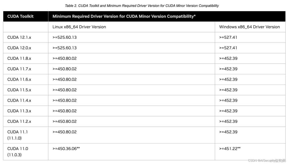 - CUDA Driver:驱动,需要与“有CUDA功能的GPU”和“CUDA”都兼容。CUDA工具包都对应一个最低版本的CUDA Driver,CUDA Driver向后兼容。