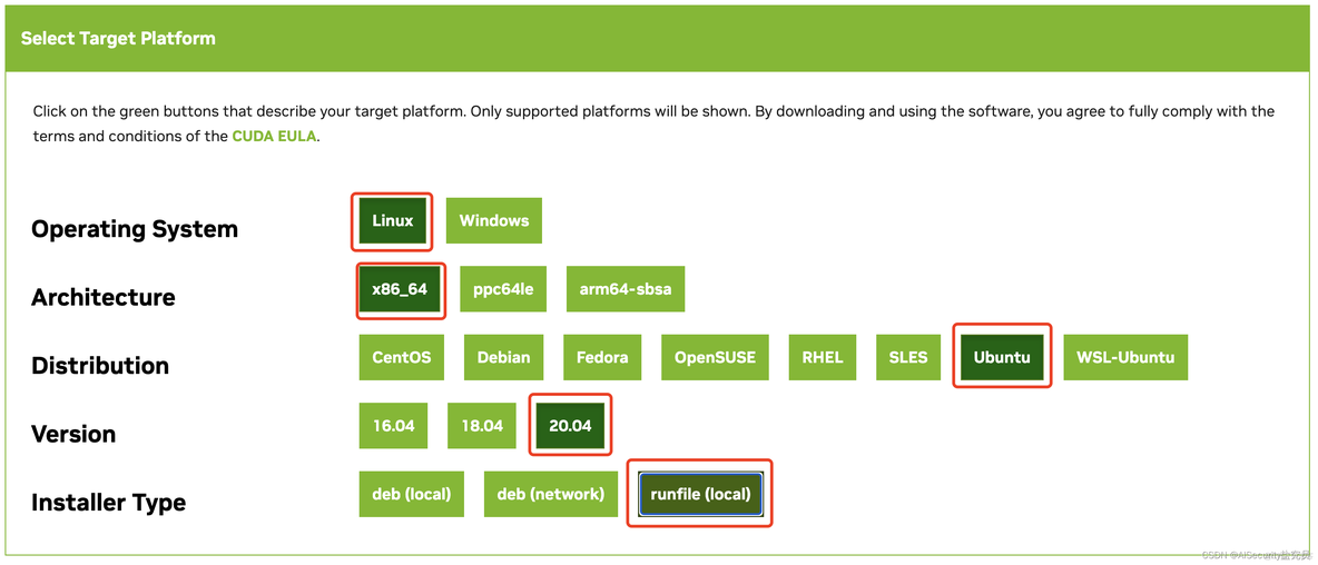 点击自己需要下载的版本,一次选择操作系统、系统架构、系统版本和安装方式,在这里推荐使用 runfile(local) 的安装方式。