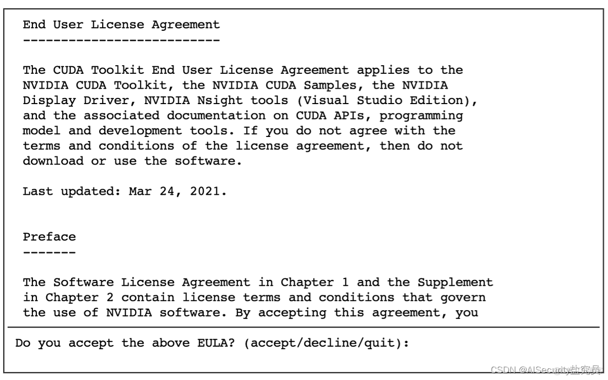执行上述命令后,等待1分钟左右,系统会弹出安装的协议,问你Do you accept the above EULA? 你需要在后面的光标处,填写accept,然后敲回车。