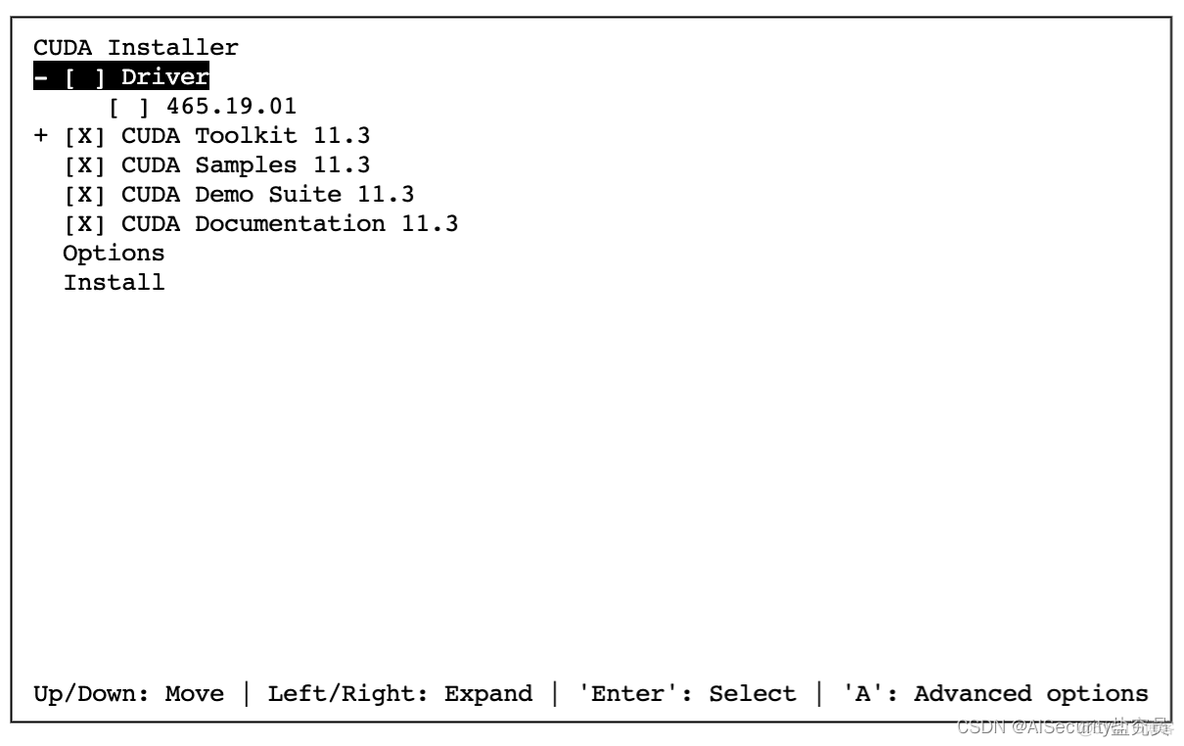 然后系统询问安装的内容,注意!!! 一定要把Driver驱动这个给去掉(按空格键可以将 X 去掉),如果[ ]内是X说明是要安装的;如果[ ]是空,说明不安装。选择完成后,然后移动至Install 处,敲击回车。