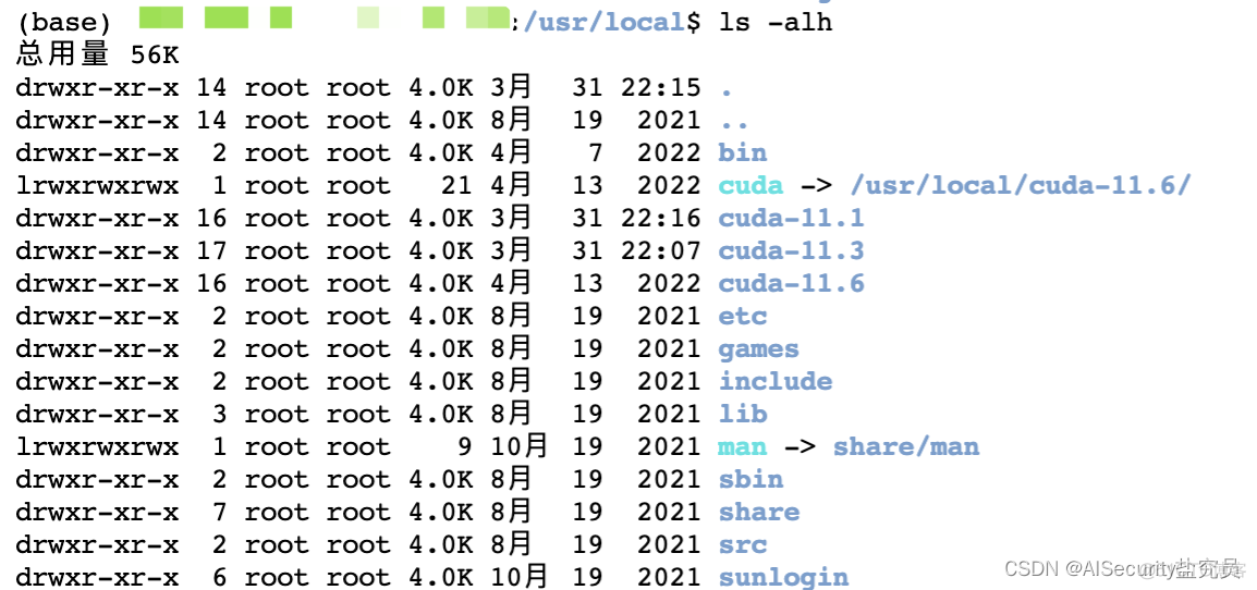 由于环境变量的地址为/usr/local/cuda,且我们可以从图中发现目录下存在一个软链接,即:/usr/local/cuda指向了/usr/local/cuda-11.6链接,说明此时尽管安装了CUDA 11.1和 CUDA 11.3版本,但系统默认的环境版本为11.6。如何进行多版本的切换呢,比如想把CUDA版本切换成11.3版本(但是要保留CUDA 11.1和11.6版本),我们只需要修改软链接即可,将CUDA 11.3的软链接链接到cuda目录下,代码如下: