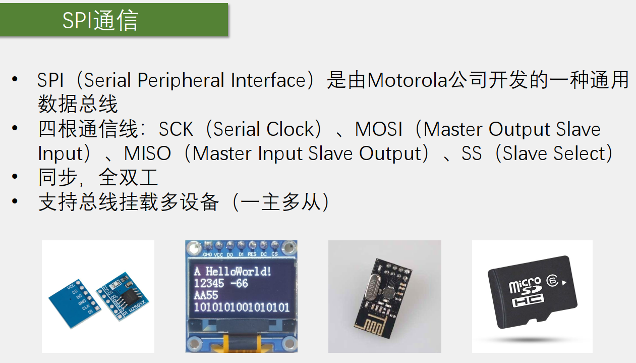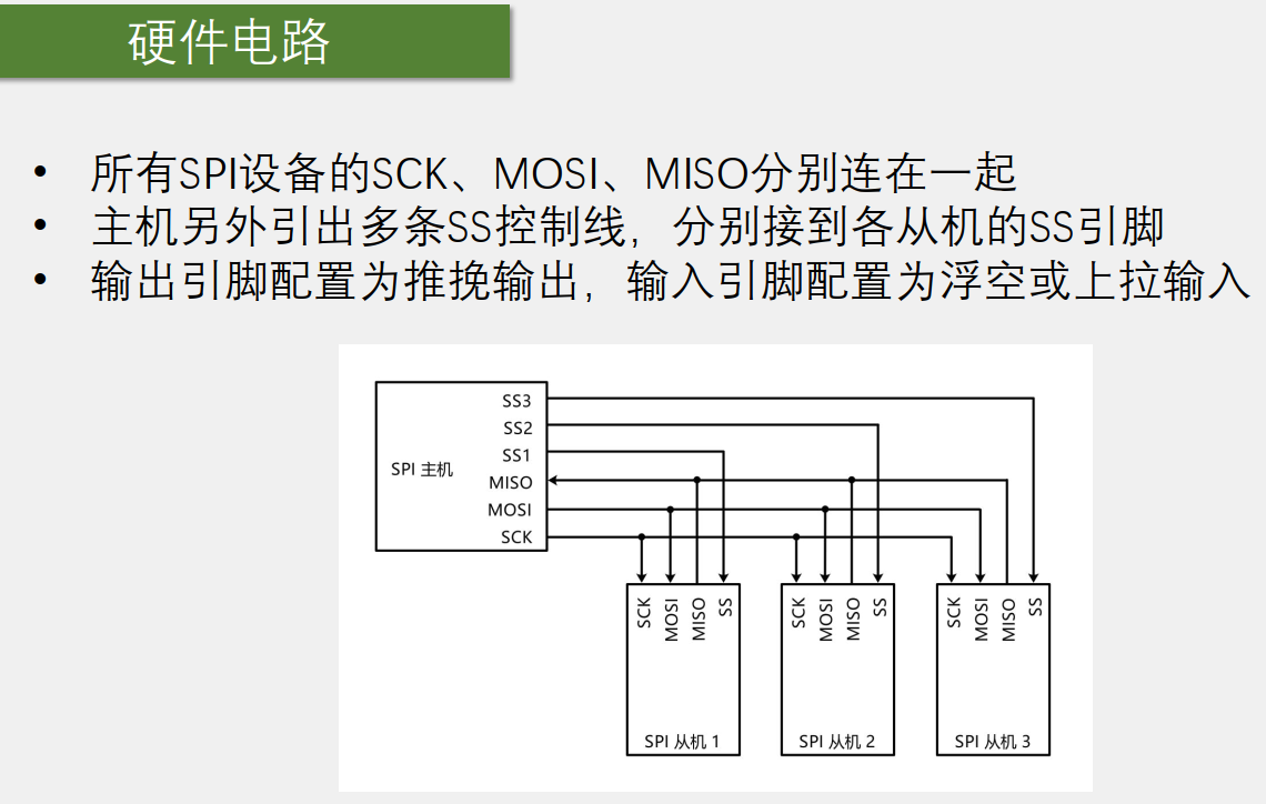 - 不过SPI还是有一个冲突点的,就是图上的MISO引脚,主机一个是输入但是三个从机全都是输出,如果三个引脚都始终是推挽输出,势必会导致冲突,所以在SPI协议里有一条规定,就是当从机的SS引脚为高电平,也就是从机未被选中时,他的MISO引脚必须切换为高阻态,高阻态就相当于引脚断开,不输出任何电平,这样就可以防止一条线有多个输出,而导致的电平冲突的问题了,在SS为低电平时,MISO才允许变为推挽输出,这是SPI对这个可能的冲突做出的规定,当然这个切换过程都是在从机里,我们一般都写主机的程序,所以我们主机的程序中并不需要关注这个问题。