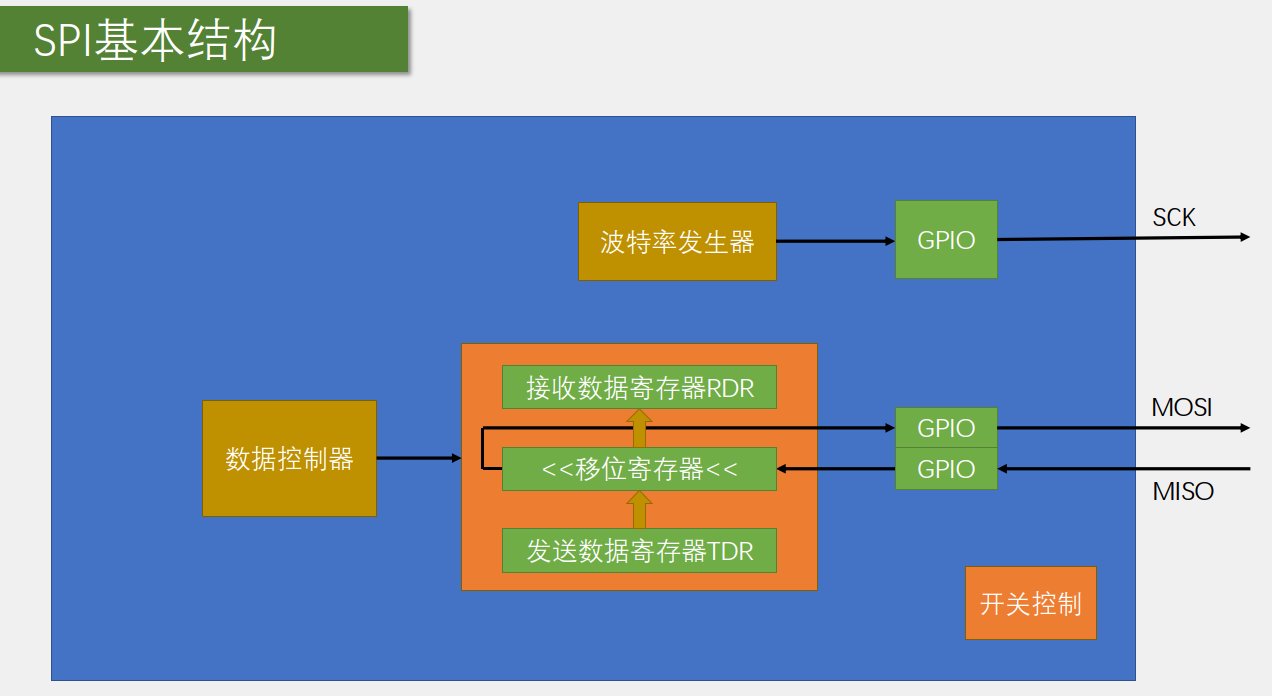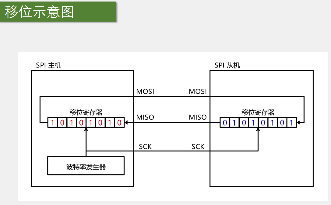 这个移位示意图是SPI硬件电路设计的核心,我们看一下SPI的基本收发电路,就是使用了这样一个移位的模型,左边是SPI主机,里面有一个八位的移位寄存器,右边是SPI从机,里面也有一个八位的移位寄存器,这里移位寄存器有一个时钟输入端,因为SPI一般都是高位先行,所以每来一个时钟,移位寄存器就会向左进行移位,从机也是同理,然后移位寄存器的时钟源是由主机提供的,这里叫做波特率发生器,它产生的时钟驱动主机的移位寄存器进行移位,同时这个时钟也通过SCK引脚进行输出接到从机的移位寄存器里,之后上面移位寄存器的接法是主机移位寄存器左边移出去的数据,通过MOSI引脚输入到从机移位寄存器的右边,从机移位寄存器左边移出去的数据通过MISO引脚输入到主机移位寄存器的右边,这样组成一个圈。