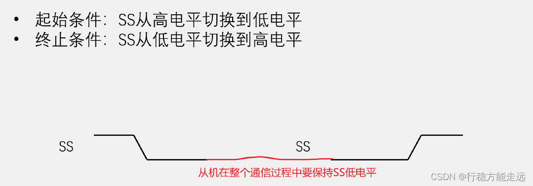 如果主机只想交换一个字节,那这时候就可以置SS为高电平结束通信了,在SS的上升沿MOSI还可以再变化一次,将MOSI制造一个默认的高电平或低电平,当然也可以不去管它,因为SPI没有硬性规定MOSI的默认电平。
