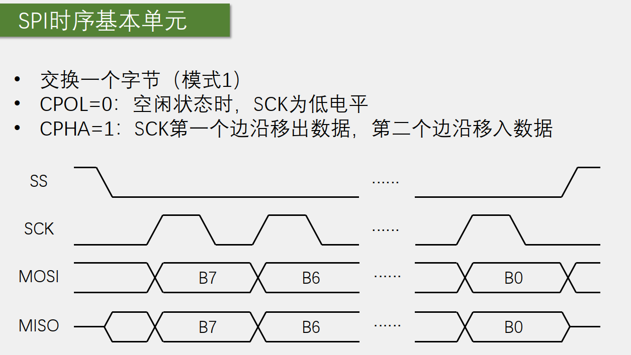模式0的CPHA=0,表示SCK第一个边沿移入数据,第二个边沿移出数据,模式0在SCK第一个边沿就要移入数据,但数据总得先移出才能移入对吧,所以在模式0的配置下,SCK第一个边沿之前就要提前开始移出数据了,或者把它称作是在第零个边沿移出在第一个边沿移入,看一下时序,首先SS下降沿开始通信,现在SCK还没有变化,但是SCK一旦开始变化,就要移入数据了,所以此时趁SCK还没有变化,SS下降沿时就要立刻触发移位输出,所以这里MOSI和MISO的输出,是对齐到SS的下降沿的,或者说这里把SS的下降沿也当作时钟的一部分了,那SS下降沿触发的输出,SCK上升沿就可以采样输入数据了,这样b7就传输完毕。之后SCK下降沿移出b6 ,SCK上升沿移入b6 ,然后继续,下降沿移出数据,上升沿移入数据,最终在第八个上升沿时,b0位移入完成,整个字节交换完成。