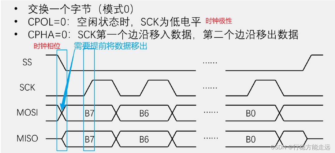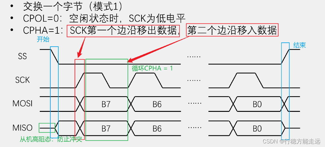 之后SCK还有一个下降沿,如果主机只需要交换一个字节就结束,那在这个下降沿时MOSI可以置回默认电平或者不去管它,MISO也会变化一次,这一位实际上是下一个字节的b7,因为这个相位提前了,所以下一个字节的b7会露个头,如果不需要的话,SS上升沿之后从机MISO置回高阻态,这是交换一个字节就结束。
