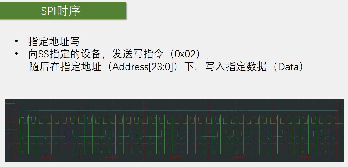 向SS指定的设备,发送写指令(0x02),随后在指定地址(Address[23:0])下,写入指定数据(Data)