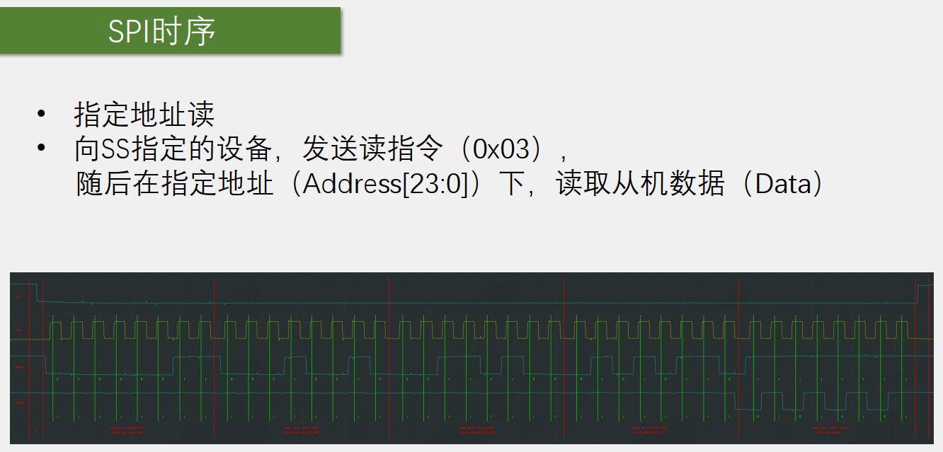 向SS指定的设备,发送读指令(0x03),随后在指定地址(Address[23:0])下,读取从机数据(Data),功能是向SS指定的设备先发送读指令,这里芯片定义0x03为读指令,随后在指定地址下读取从机数据,我们看一下时序:
