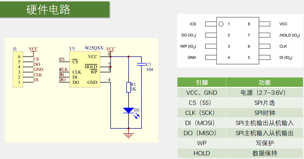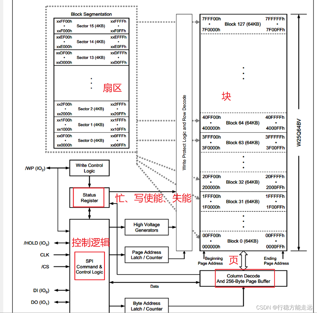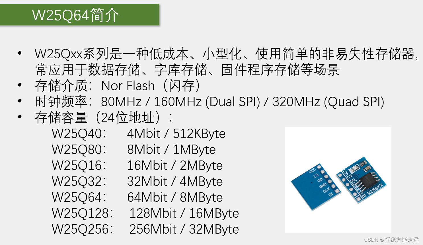 这个芯片的存储介质是Nor Flash,Flash就是闪存存储器,像我们STM32的程序存储器、u盘、电脑里的固态硬盘等使用的都是Flash闪存,闪存分为Nor Flash和Nand Flash,两者各有优势和劣势,适用领域不同,这个感兴趣的话可以百度了解一下。