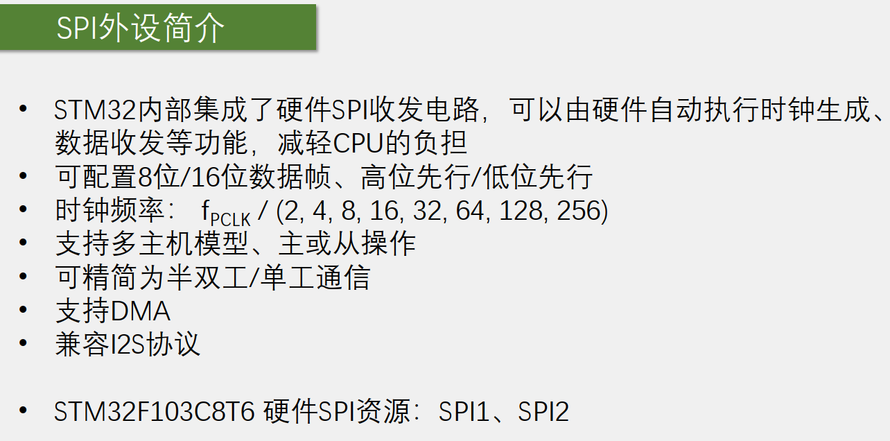 - 对输出我们配置推挽输出,高低电平均有很强的驱动能力,这将使得SPI引脚信号的下降沿非常迅速,上升沿也非常迅速,不像I2C那样下降沿非常迅速,但是上升沿就比较缓慢了,那得益于推换输出的驱动能力,SPI信号变化的快,那自然它就能达到更高的传输速度,一般SPI信号都能轻松达到兆赫兹的速度级别,I2C并不是不想使用更快的推挽输出,而是I2C要实现半双工,经常要切换输入输出,而且I2C又要实现多主机的时钟同步和总线仲裁,这些功能都不允许I2C使用推挽输出,要不然你不小心就电源短路了,所以I2C选择了更多的功能,自然就要放弃更强的性能了,对SPI来说,首先SPI不支持多主机,然后SPI就是全双工,SPI的输出引脚始终是输出,输入引脚始终是输入,基本不会出现冲突,所以SPI可以大胆的使用推挽输出;
