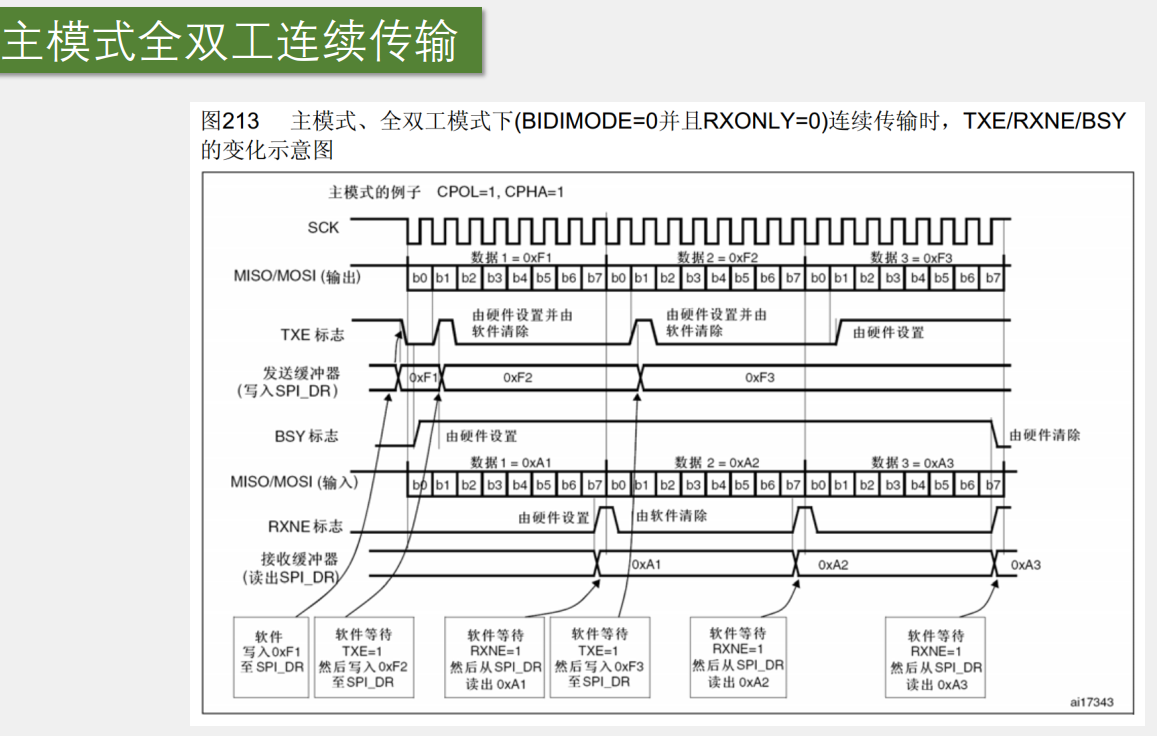 如果主机想交换多个字节的话,那就继续调用从这里到这里的时序,在最后一个下降沿主机放下一个字节的b7 ,从机也放下一个字节的b7, SCK上升沿正好接着采样第二个字节的b7,这样时序才能拼接得上,就是SPI交换一个字节的模式零。