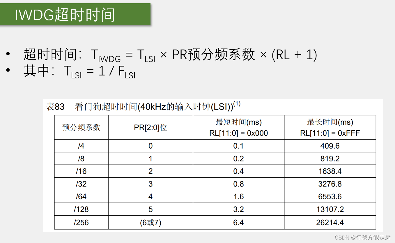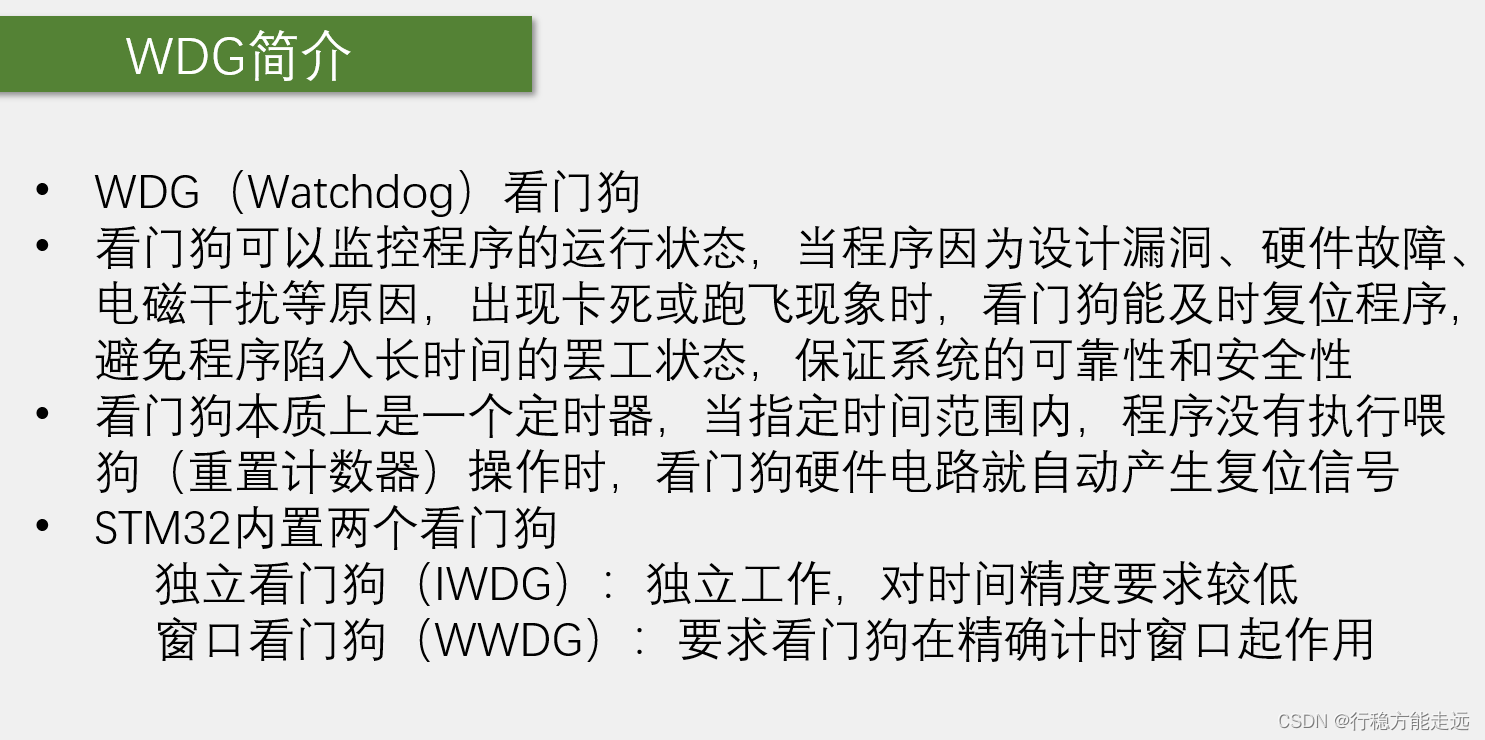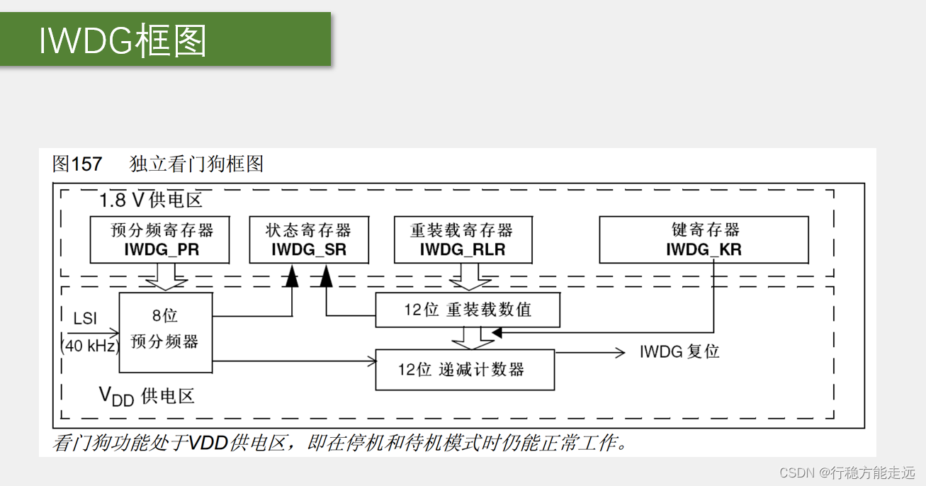 我们继续看第二条,在可能存在干扰的情况下,一般通过在整个键寄存器写入特定值来代替控制电容器写入移位的功能,以降低硬件电路受到干扰的概率,为什么能降低干扰呢,你看独立看门狗工作的环境是什么,是程序可能跑飞,可能受到电磁干扰,程序做出任何操作都是有可能的,如果你只在寄存器中设置一个位,那这1位就有可能在误操作中变成1,或者变成0,这个概率是比较大的,所以单独设置1位就来执行控制,在这里比较危险,这时我们就可以通过,在整个寄存器写入一个特定值来代替,写入1个位的操作,比如这里键寄存器是16位的,只有在键寄存器写入0xAAAA这个特定的数,才会执行喂狗的操作,这样就会降低误操作的概率。