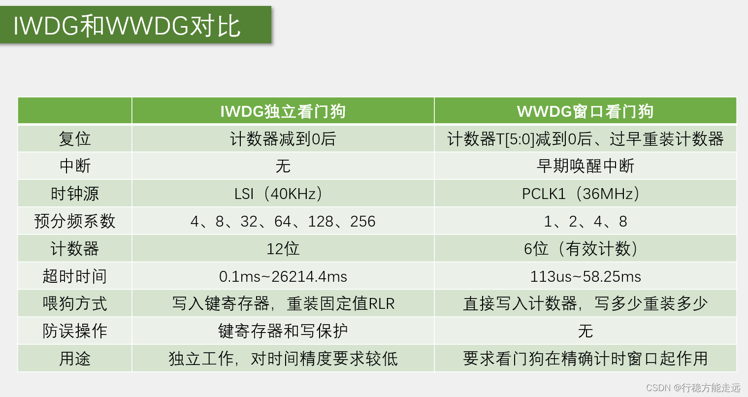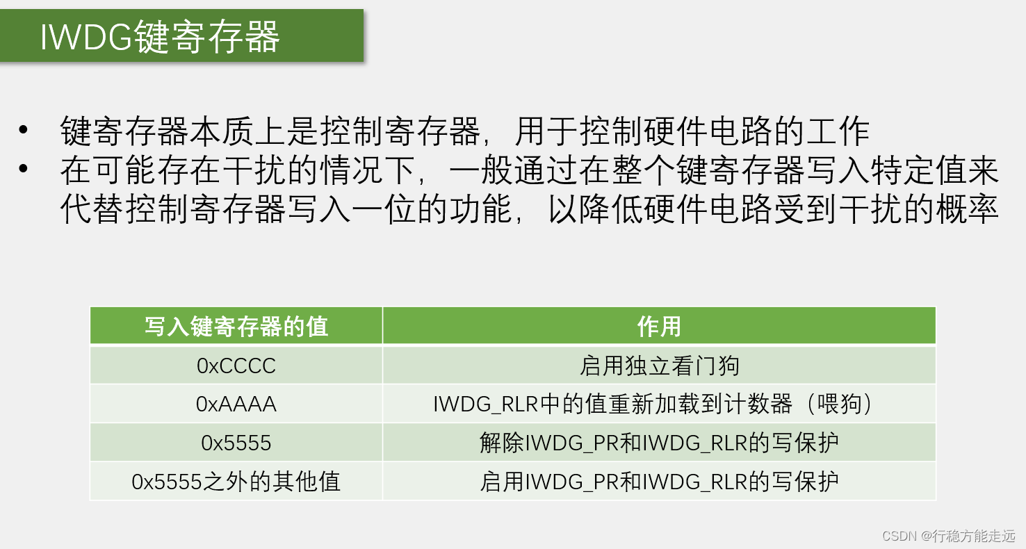 键寄存器本质上是控制寄存器,用于控制硬件电路的工作,比如上面说的喂狗操作,就是通过在键寄存器写入0xAAAA完成的,那为什么要用键寄存器呢,我直接定义一个控制寄存器,其中再定义一个位,这一位写入1就喂狗,这样不也行吗?