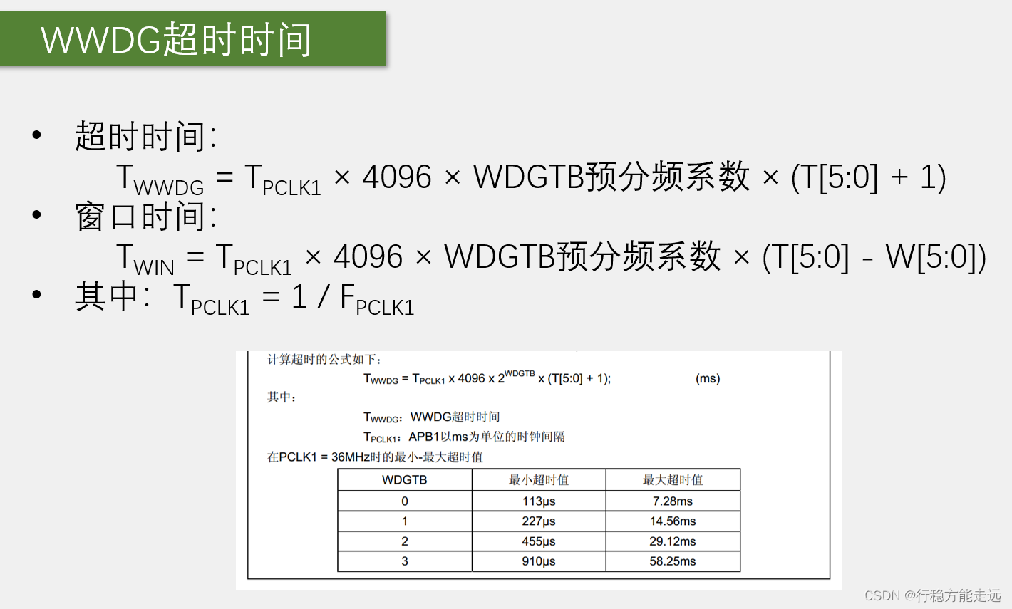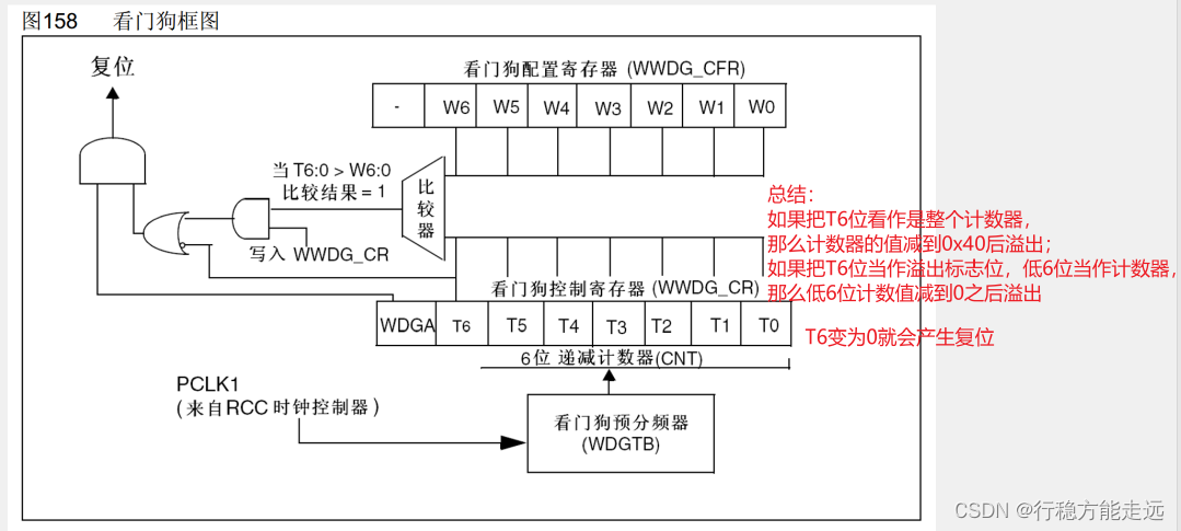 - 接下来,或门的另一路,看门狗时间的最早界限,由上面这一块来实现,首先我们要计算一个最早界限的计数值,写到这里的W6~W0中,写入之后是固定不变的,在这里一旦我们执行写入CR操作时,这个与门开关就会打开,写入CR其实就是写入计数器,也就是喂狗,在喂狗时,这个比较器开始工作,一旦它比较我们当前的计数器,T6:0>窗口值W6:0,比较结果就等于1,这个一通过或门也可以去申请复位,这是喂狗最早时间窗口的实现流程,就是喂狗的时候,我把当前记数值和预设的窗口值进行比较,如果发现你的狗余粮还非常充足,你喂的这么频繁,那肯定是有问题,我要给你复位一下,不让你喂太早了。