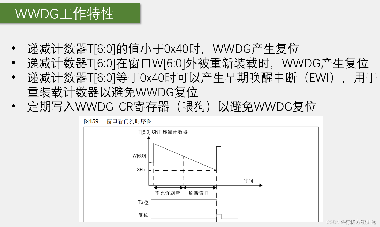 递减计数器T[6:0]等于0x40时可以产生早期唤醒中断(EWI),用于重装载计数器以避免WWDG复位,这里的意思就是,减到0x40时产生中断,然后再减一个数到0x3F时产生复位,那这个中断其实就是在溢出的前一刻发生,所以这个中断也可以称作死前中断,马上就要溢出复位了,再提醒一下你要不要干点啥,我们一般可以用来执行一些紧急操作,比如保存重要数据,关闭危险设备等等,或者还有一种写法,就虽然超时喂狗了,但是我们可以在中断里执行一些代码,进行解决,或者这个任务不是很危险,超时了我就只想做一些提示,不想让他复位了,这样的话我们就可以在这个早期唤醒中断里直接执行喂狗,阻止系统复位,然后提示一下信息就完事儿了。
