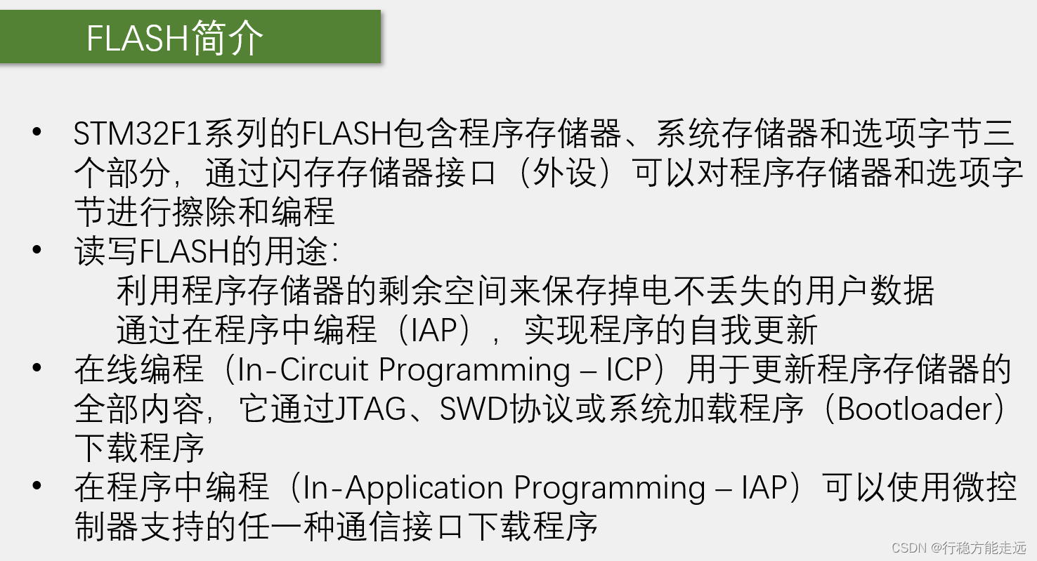 本节我们学习的闪存是特指STM32的内部闪存,也就是我们下载程序的时候程序所存储的位置。