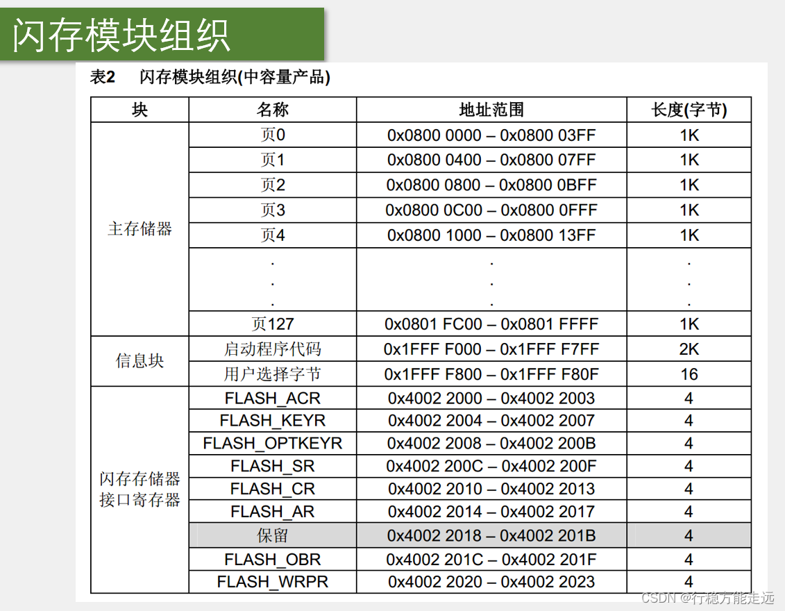 然后继续系统存储器,它的起始地址是0x1FFFF000,这个之前介绍过的,它的容量是2K,下面选项字节起始地址是0x1FFFF800,容量是16个字节,里面只有几个字节的配置参数,这个后面还会继续说的,那这里还可以发现我们平时说的芯片闪存容量是64K128K,它指的只是主存储器的容量,下面信息快的这两个东西虽然也是闪存,但是并不统计在这个容量里,这是闪存的分配方式,那最后就是这个闪存接口寄存器,里面包括KEYR键寄存器,SR状态寄存器,CR控制寄存器,外设的起始地址是0X4002 2000,每个寄存器都是四个字节也就是32位。