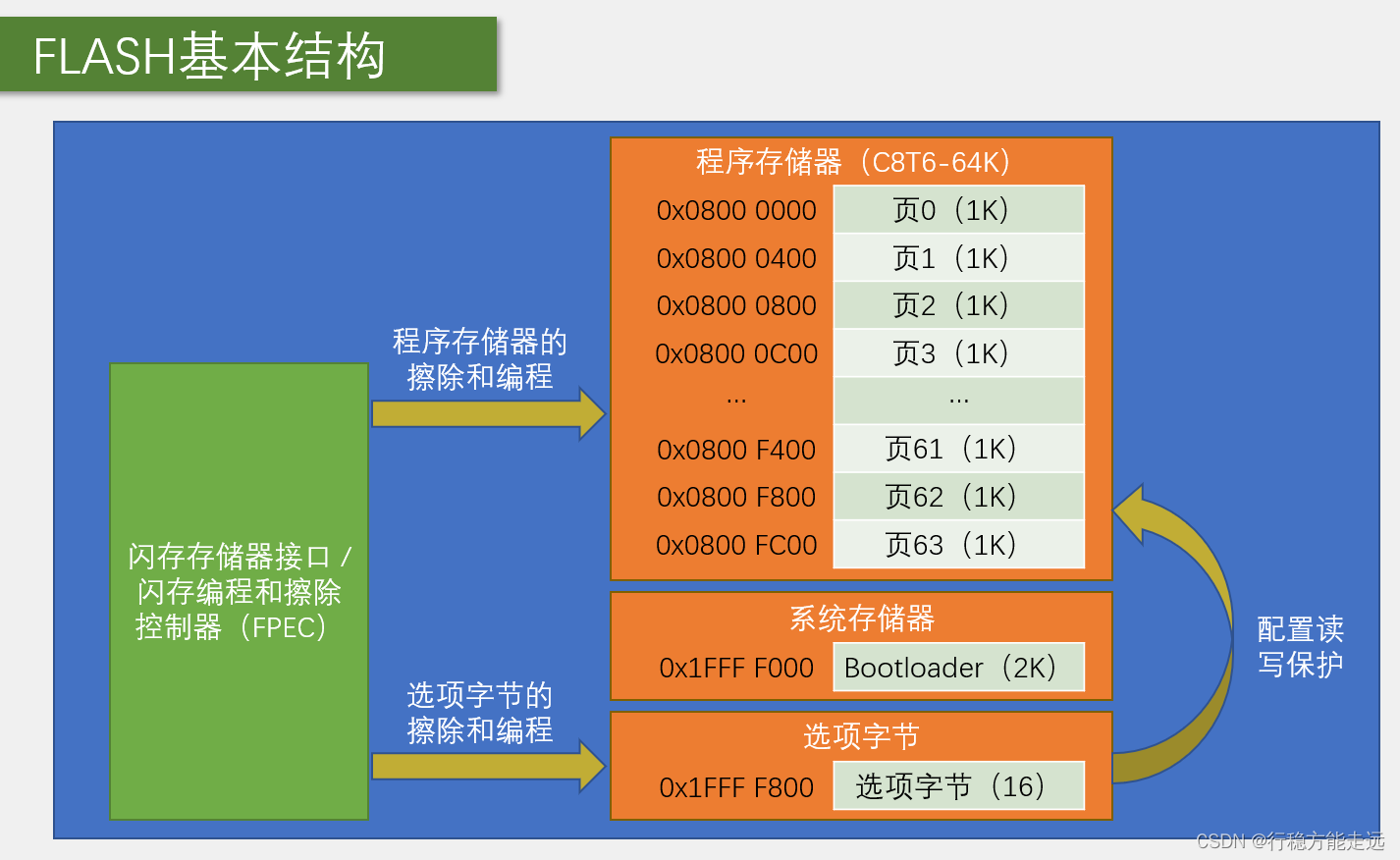 接下来看一下我总结的这个基本结构图,整个闪存分为程序存储器、系统存储器和选项字节三部分,这里程序存储器为以C8T6为例,它是64K的,所以总共只有64页,最后一页的起始地址是0x0800FC00,左边这里是闪存存储器接口,手册里还有个名称,闪存编程和擦除控制器FPEC,大家也知道这两个名称其实是一个东西就行,然后这个控制器就是闪存的管理员,他可以对程序存储器进行擦除和编程,也可以对选项字节进行擦除和编程,系统存储器是不能擦除和编程的,这个选项字节里面有很大一部分配置位,其实是配置主程序存储器的读写保护的,所以右边画的写入选项字节,可以配置程序存储器的读写保护,当然选项字节还有几个别的配置参数,这个待会再讲,那这就是整个闪存的基本结构。