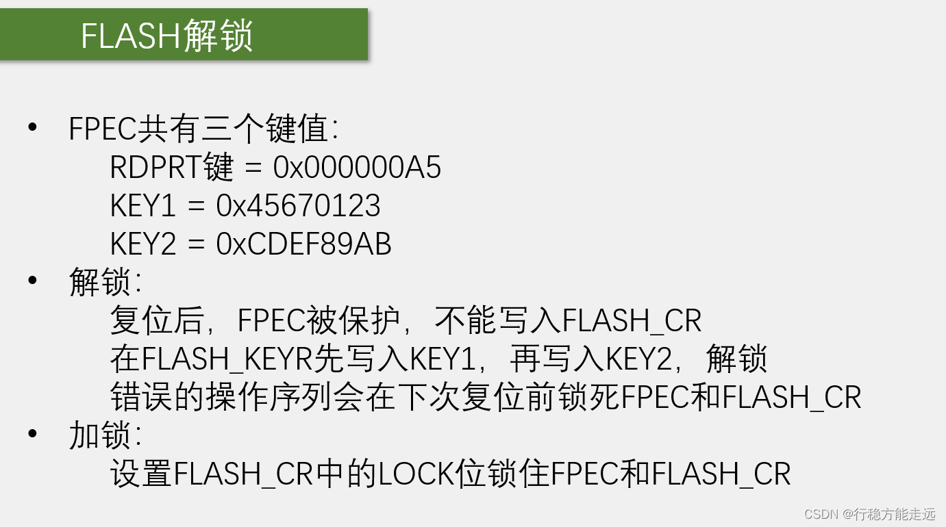 - 继续看怎么解锁呢,第一个是复位后FPEC被保护,不能写入FLASH_CR,也就是复位后Flash默认是锁着的,然后在FLASH_KEYR键寄存器中,先写入KEY1,再写入KEY2解锁,我们找到了锁,这个锁是KEYR寄存器,怎么解呢,要先用K1钥匙解,再用K2钥匙解,最终才能解锁成功,所以这个锁的安全性非常高,有两道锁,即使程序跑飞了,歪打正着正好写入了KEY1,那也难以保证下一次又歪打正着写入了KEY2,所以非人为情况下基本不可能解锁;