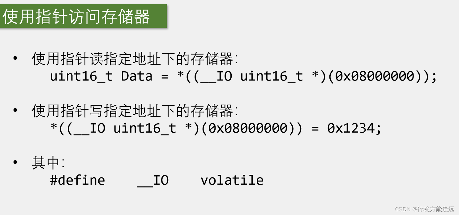 接着看下一个知识点,这个地方我们要学习的是,如何使用指针访问存储器,因为STM32内部的存储器是直接挂在总线上的,所以这时在读写某个存储器就非常简单了,直接使用C语言的指针来访问即可。