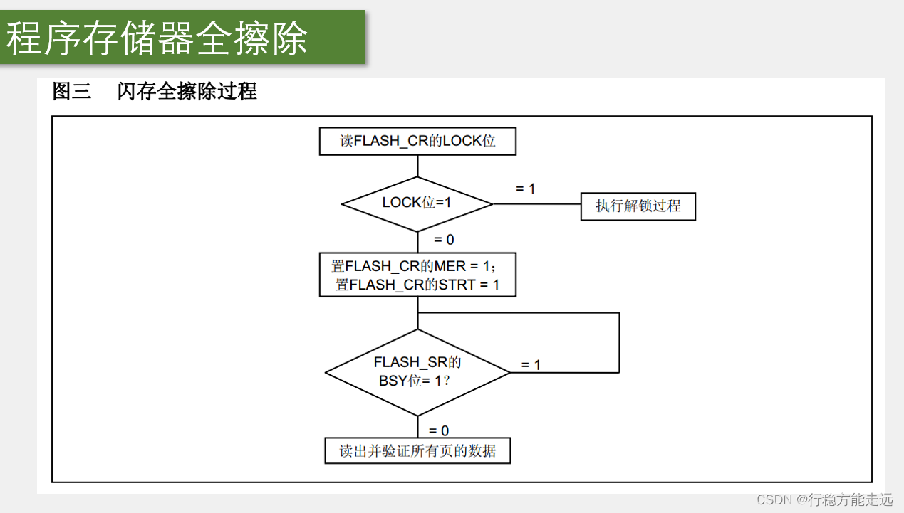 然后解锁之后,首先置控制寄存器里的MER(Mass Erase)位为1,然后再置STRT(Start)位为1,其中STRT为1是触发条件,STRT为1之后芯片开始干活,然后现在看到MER位是1,它就知道接下来要干的活就是全删除,这样内部电路就会自动执行全擦除的过程;