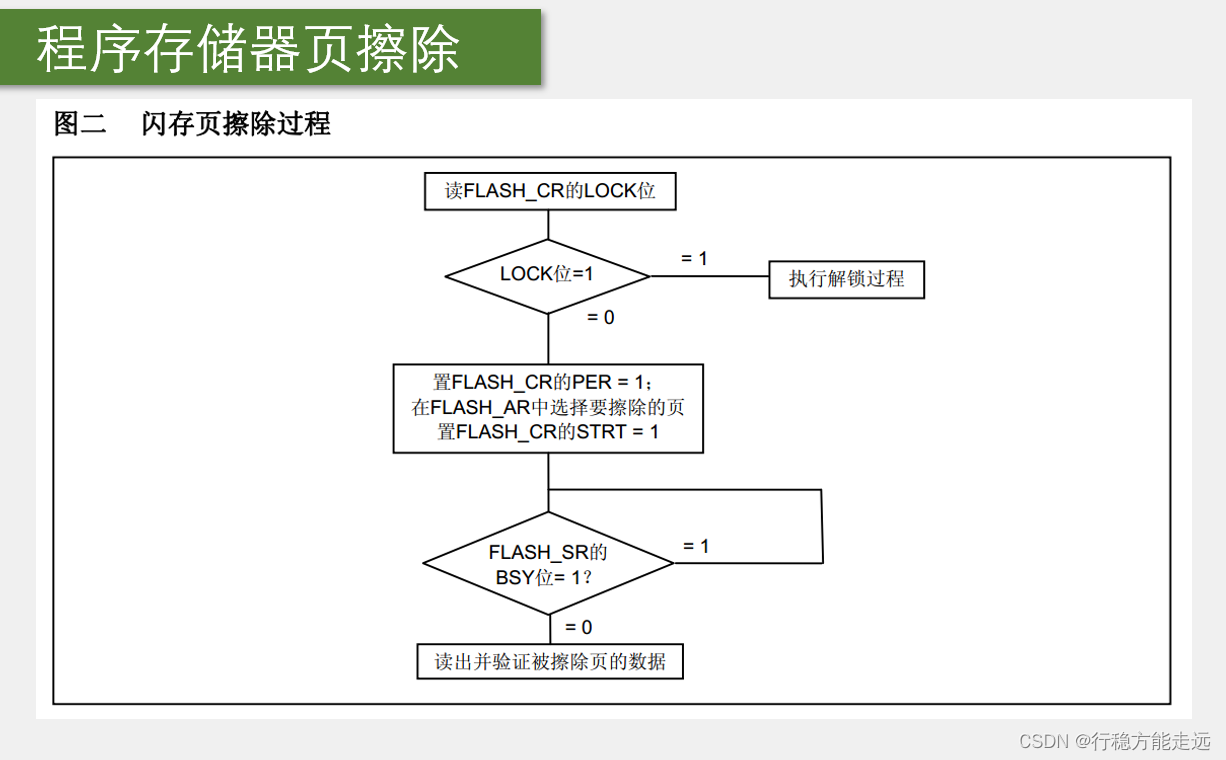 然后看一下页擦除,这个也是类似的过程,第一步一样的是解锁的流程,第二步,这个方框里的置控寄存器的PER(Page Erase)位为1,然后在AR(Address Register)地址寄存器中选择要擦除的页,最后置控制寄存器的STRT位为1,也是触发条件,芯片开始干活,然后芯片看到PER等于1,它就知道接下来要执行页擦除,然后闪存不止一页,页擦除芯片就要知道要具体擦哪一页,所以它会继续看AR寄存器的数据,AR寄存器我们要提前写入一个页的起始地址,这样芯片就会把我们指定的一页给擦除掉,然后擦除开始之后,我们也要等待BSY位,最后读出并验证数据,这个就不用看了。