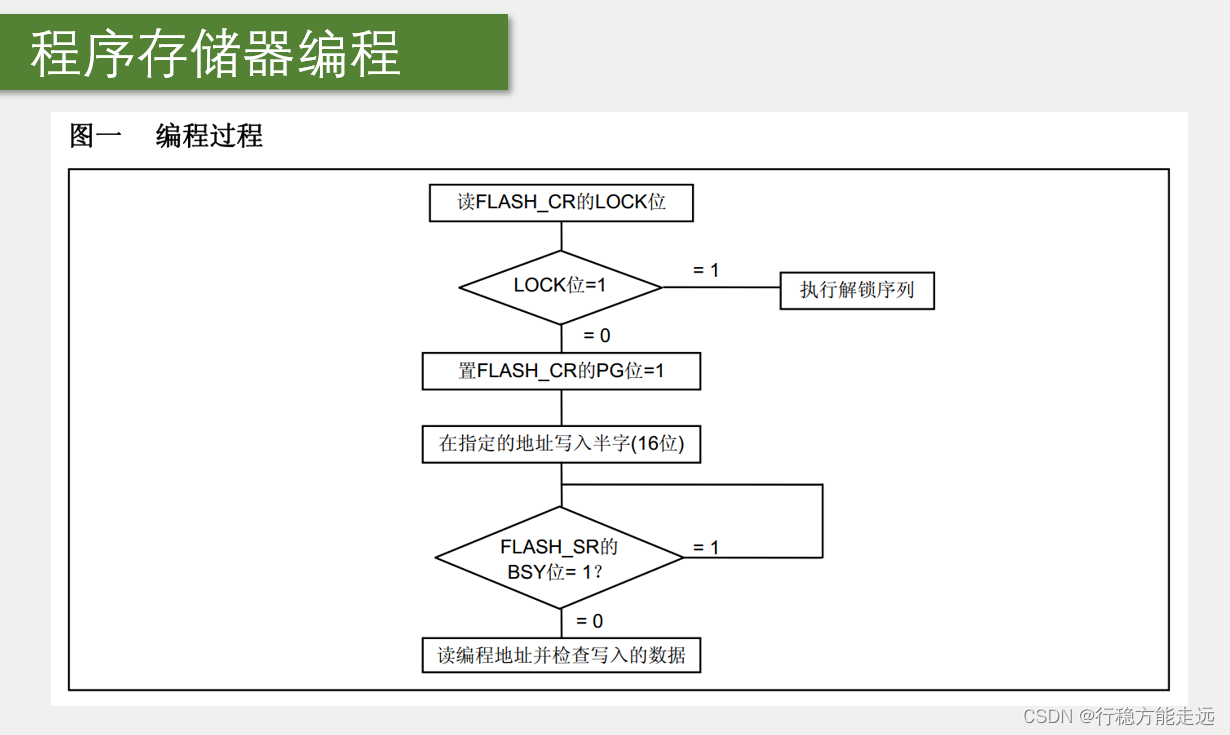 那回到流程图这里,写入数据这个代码就触发开始的条件,不需要像擦除一样置STRT位了,写了半字之后,芯片会处于忙状态,我们等待一下BUSY清0,这样写入数据的过程就完成了,那每执行这样一个流程,只能写入一个半字,如果要写出很多数据,要不断循环调用这个流程就可以了。
