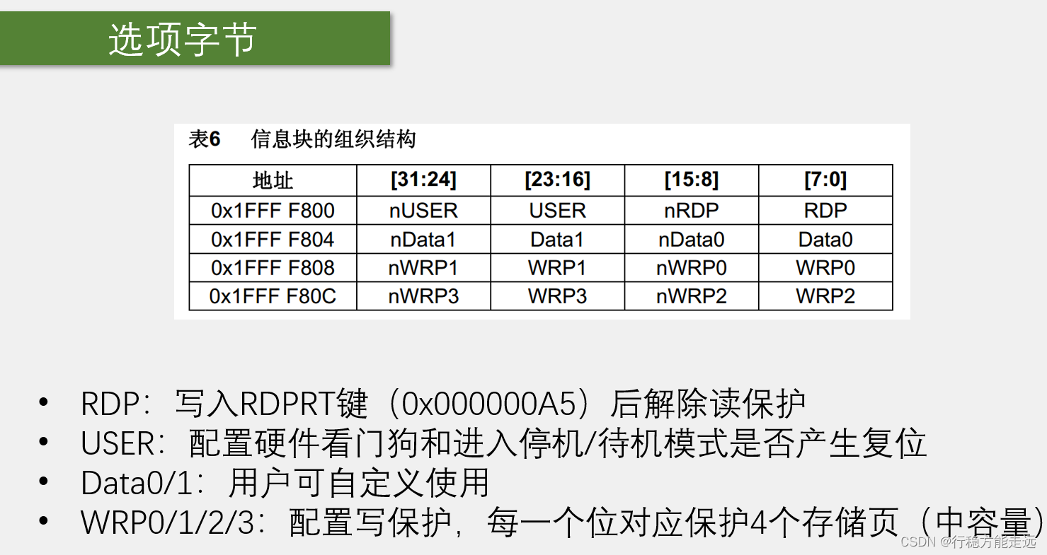 - 最后四个字节,WRP(Write Protect)0、1、2、3这四个字节配置的是写保护,在中容量产品里是每一个位对应保护四个存储页,四个字节总共32位,一位对应保护四页,总共保护32×4等于128页,正好对应中容量量的最大128页,那对于小容量和大容量产品呢,可以看一下手册,2.5选项字节说明这里,对于小容量产品,也是每一位对应保护四个存储页,但小容量产品最大只有32K,所以只需要一个字节WRP0就行,4×8=32,其他三个字节没用到,然而对于大容量产品,每一个位只能保护两个存储页,这样的话四个字节就不够用了,所以这里规定WRP3的最高位,这一位直接把剩下的所有页一起都保护了,这是写保护的定义。