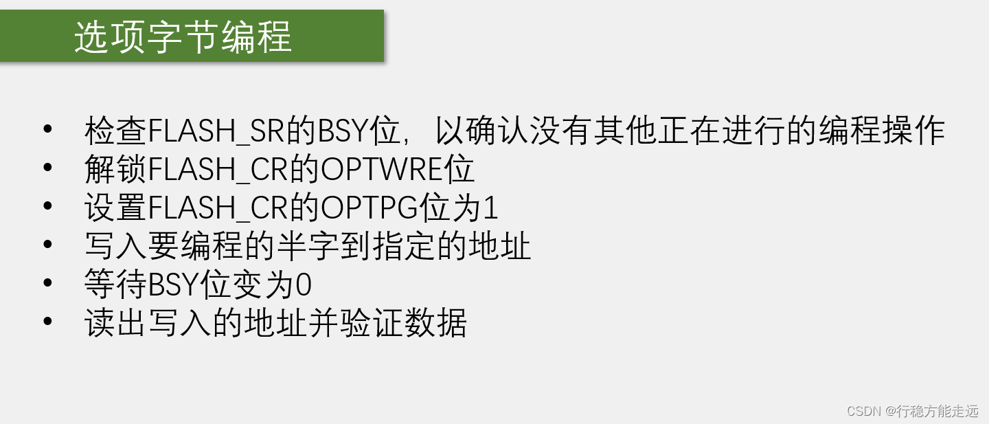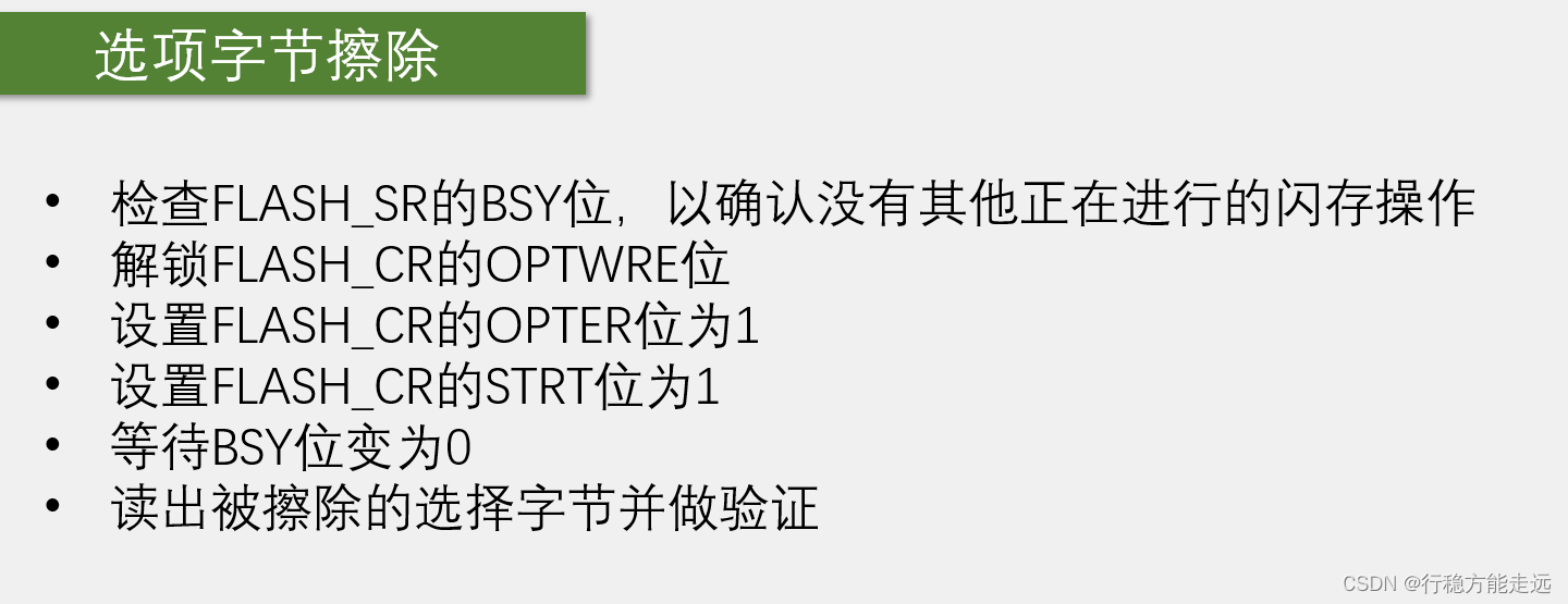 看一下如何去写入这些位呢,这里两页PPT展示的就是选项字节的擦除和编程,因为选项字节本身也是闪存,所以它也得擦除,这里参考手册并没有给流程图,我们看一下这个文字流程,这个文字流程和流程图细节上有些出入,我们知道关键部分就行。