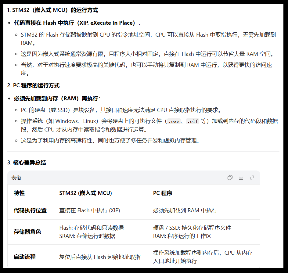 你这个问题问到了 STM32 程序运行的核心本质——代码烧录到 Flash,但程序运行时数据会加载到 SRAM,这是嵌入式系统和 PC 程序最关键的区别之一(如下图所示)。